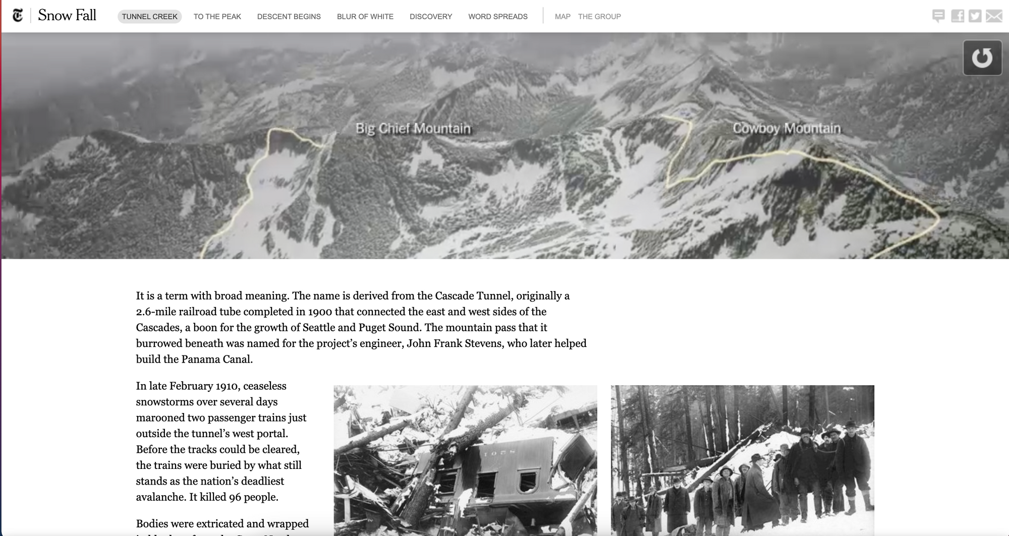 Remember a DECADE AGO when the New York Times published John Branch's Snow Fall? The story reported the gripping (and harrowing, I feel like I'm supposed to describe this story as harrowing) tale of a group of athletes who got caught in an avalanche in Washington State. Snow Fall was not just an incredible piece of reporting, it was also an incredible piece of digital journalism as it showcased new forms of storytelling.